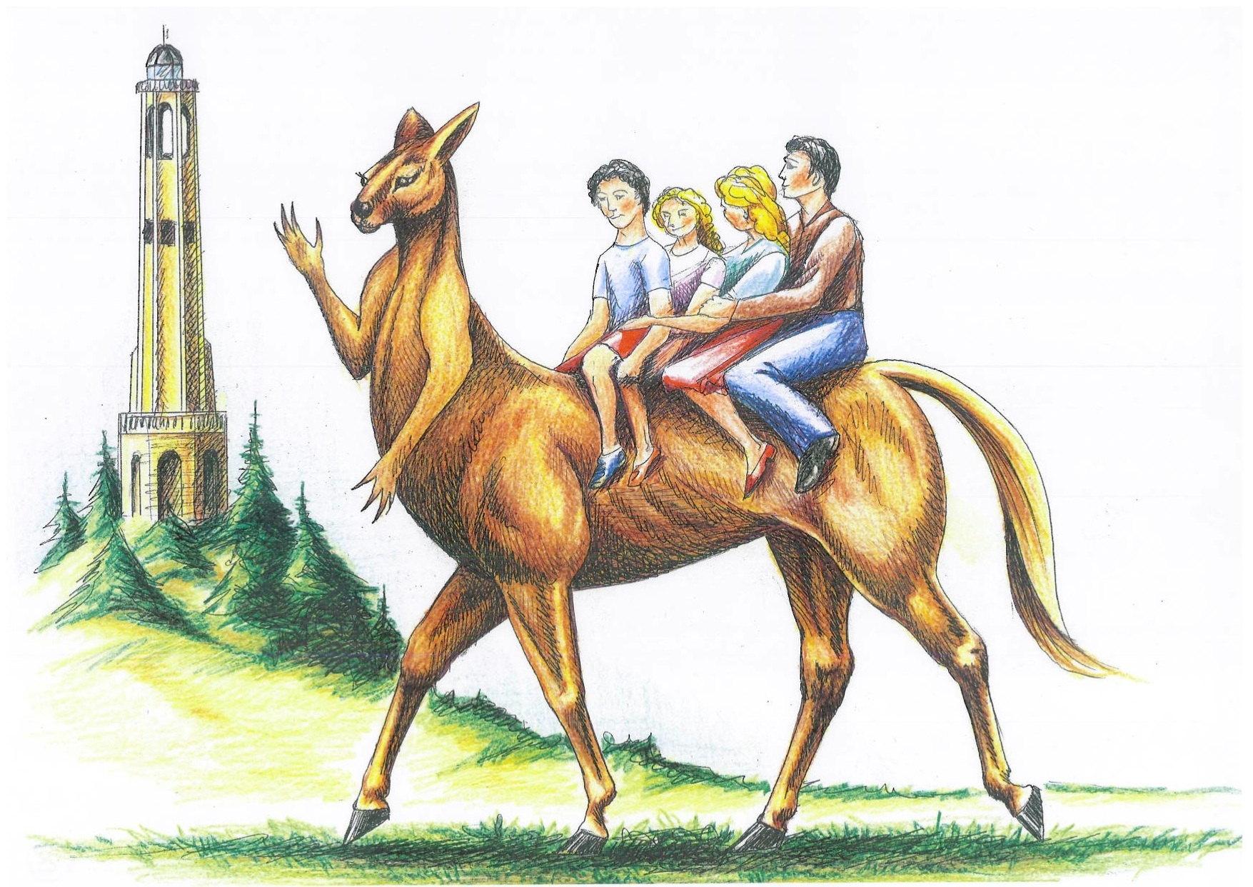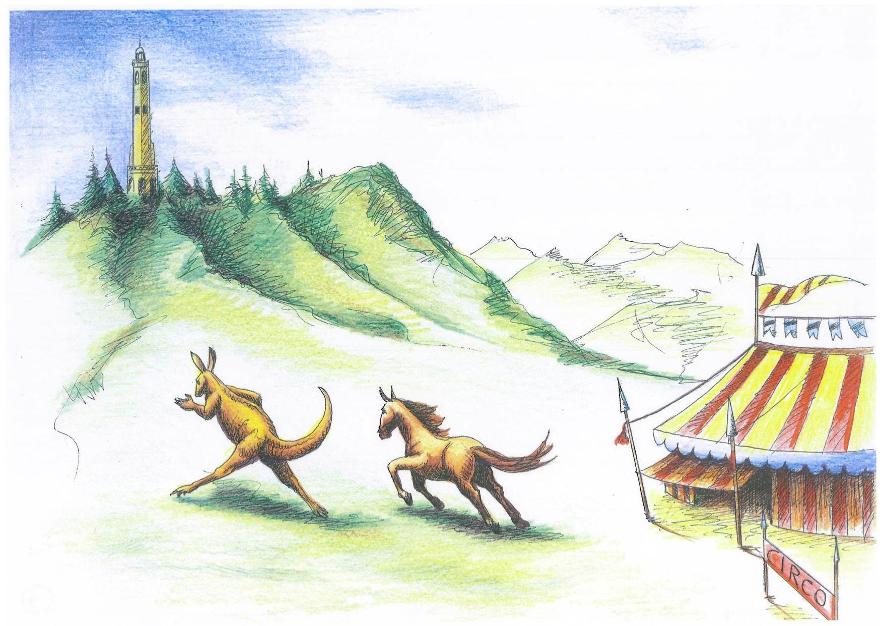 Looking at the three-coloured beams the father said: “I wish there was a horse which could carry my wife, my daughter and my self and kangaroo to carry my son in the pouch”. His wish was fulfilled as in that moment the Kangucavallo appeared, half horse and half kangaroo.